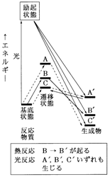 対して何種類かの反応経路がありますが,ある温度で実際に起こるのはそのうち最も活性化エネルギーの小さな経路だけです。もっと大きな活性化エネルギーの反応を起こすには温度を上げなければならず,中には熱分解反応が起こってうまくいかないことも十分あり得ます。図12に示した例では三通りの経路のうち,経路A→C' は活性化エネルギーが大きく反応が遅いために,C→A' は生成物が安定でないという熱力学的な理由のために,共に反応は起きにくくなっています。実際に起こるのはB→B' 反応だけです。しかし光反応では励起状態が十分なエネルギーを持っているために,エネルギー不足から来る問題は解消されてしまいます。その結果, A' , B' , C' いずれの生成物も生じ得るのです。もっともA' は直ぐに分解してしまうでしょうが。