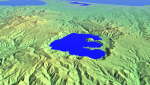 十和田湖の鳥瞰図と立体図。 鳥瞰図は十和田この中心からそれぞれの方向に20km,標高10000mから見た図。 いずれも国土地理院発行数値地図50mメッシュ(標高)のデータに基づき 「カシミール3D」により作成。