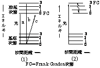 (a) フランク・コンドンの原理:この原理は,「電子遷移(10-15 s)は核の運動(10-12 s)に比べると非常に速いので,電子遷移に際して核は互いの位置あるいは運動エネルギーをそんなに変えない」というものです。核は電子よりも約1840倍重いですから動きが鈍く,電子が遷移する短い時間の間は動かないとみなしてもよいだろう,ということです。