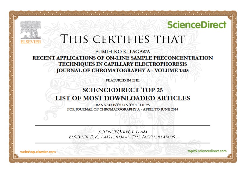 | RECENT APPLICATIONS OF ON-LINE SAMPLE PRECONCENTRATION TECHNIQUES IN CAPILLARY ELECTROPHORESIS JOURNAL OF CHROMATOGRAPHY A - VOLUME 1335 FEATURED IN THE SCIENCEDIRECT TOP 25 LIST OF MOST DOWNLOADED ARTICLES RANKED 19TH ON THE TOP 25 FOR JOURNAL OF CHROMATOGRAPHY A - APRIL TO JUNE 2014. |