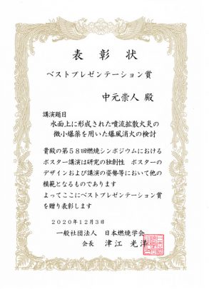 学会名:日本燃焼学会 第58回燃焼シンポジウム 賞の名称:ベストプレゼンテーション賞 受賞者:中元 崇人(大学院博士前期課程知能機械工学コース2年,鳥飼研究室) 受賞題目:水面上に形成された噴流拡散火炎の微小爆薬を用いた爆風消火の検討