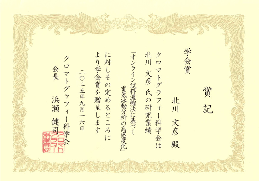 北川 文彦 准教授(物質創成化学科)が,クロマトグラフィー科学会学会賞を受賞しました。