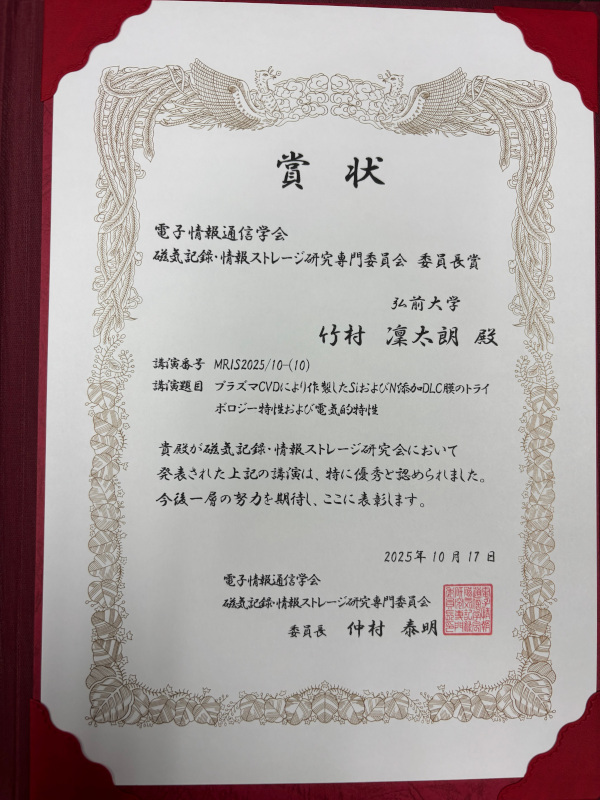 大学院博士前期課程1年の竹村 凜太朗さん(電子情報工学コース・中澤研究室)が,電子情報通信学会 磁気記録・情報ストレージ研究専門委員会 委員長賞を受賞しました。
