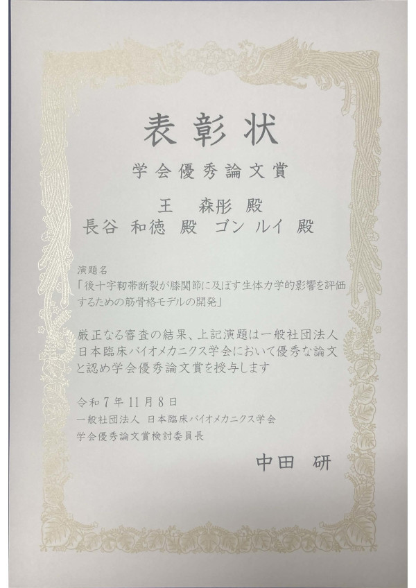 機械科学科の王 森彤 助教らが,日本臨床バイオメカニクス学会において,学会優秀論文賞を受賞しました。