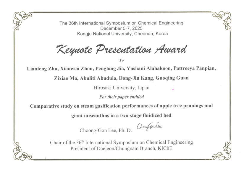 賞の名称: Keynote Presentation Award 受賞者 : 理工学研究科 博士後期課程3年 朱蓮峰(Zhu Liangfeng) 受賞題目: “Comparative study on steam gasification performances of apple tree prunings and giant miscanthus in a two-stage fluidized bed” 受賞日 : 令和7年12月6日