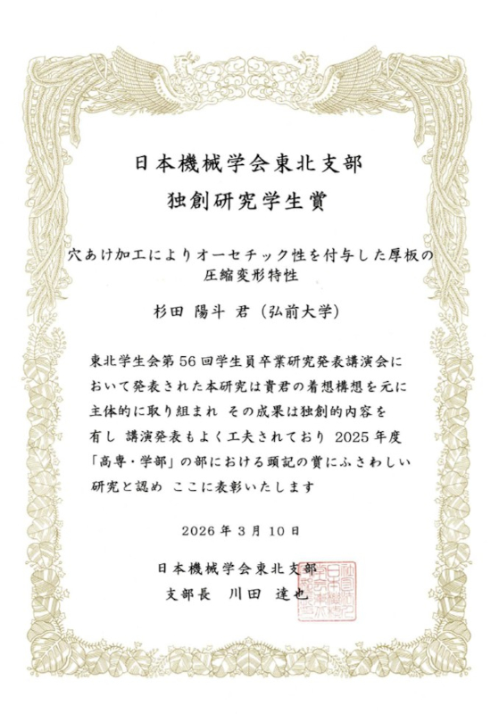 開催日時:2026年3月10日(火) 学会名:日本機械学会東北学生会 第56回卒業研究発表講演会 発表者名:理工学部機械科学科 学部4年 杉田陽斗(藤﨑研究室所属) 題名:穴あけ加工によりオーセチック性を付与した厚板の圧縮変形特性 著者:杉田陽斗,藤﨑和弘,笹川和彦,三浦鴻太郎 表彰:独創研究学生賞