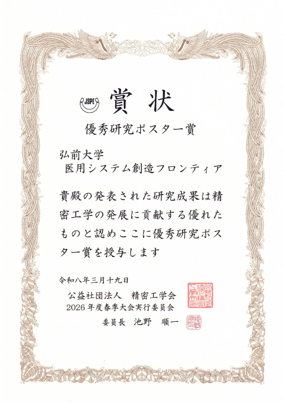 医用システム創造フロンティアが,精密工学会2026年度春季大会において,優秀研究ポスター賞を受賞しました。