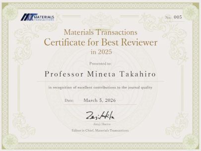 機械科学科の峯田 才寛 准教授がMaterials Transactions誌より表彰されました。