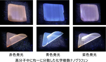 ナノグラフェンが自己組織化したとき,エッジ部分に導入した有機置換基の分子運動が抑制される可能性があります。実際に,エッジ部分に凝集誘起発光(Aggregation Induced Emission (Enhancement))を示す有機置換基を導入したところ,ナノグラフェンの自己組織化により,有機置換基の発光強度が増大することを見出しました。この成果は,適切な化学修飾をナノグラフェンに施すことで,様々な展開が可能であることを示しています[11]。この成果を活用することで,ナノグラフェンを高分子中に均一に分散でき,凝集による消光を防ぎつつ,かつ赤色や青色,それらの加色混合により単独で紫色に発光するナノグラフェンを実現しました(図5)。